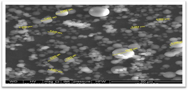 Scanning electron microscopy (Joel LV-5600, USA) was applied to obtain photomicrographs which were used to identify and confirm the surface topography of the microspheres.