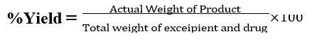 The percentage yield of microsphere determined by weighing after drying. The prepared microspheres with a size ranging from 15µm to 25µm. The measured weight of prepared microspheres was divided by the total amount of all the non volatile components used for the preparation of the microspheres, which give the total percentage yield of microspheres.