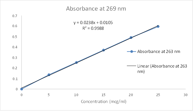 50 mg of drug vinpocetine was dissolved in 75ml methanol(cosolvent) then volume was make up to 100ml with phosphate buffer 6.8 make stock solution of concentration 500µg/ml. Then 0.5 ml of stock solution was taken and diluted upto 100ml with the buffer of pH 6.8 and to get concentration of 5µg/ml and in similar way dilution were made as 5, 10, 15, 20 and 25 µg/ml respectively and absorbance measured at 269 nm by UV visible spectrophotometer. The absorbance values were plotted against concentration (µg/ml) to obtain the standard calibration curve.