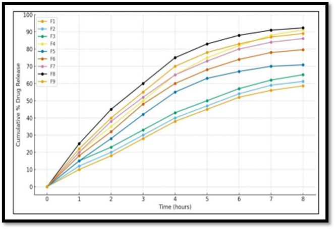 The optimized formulation (F7) demonstrated a controlled release profile with ≈ 95 % drug released within 12 hours. Formulations F1–F3 showed faster release due to lower polymer content, while F8 and F9 retarded release beyond 12 h due to excess hydrophobic matrix.