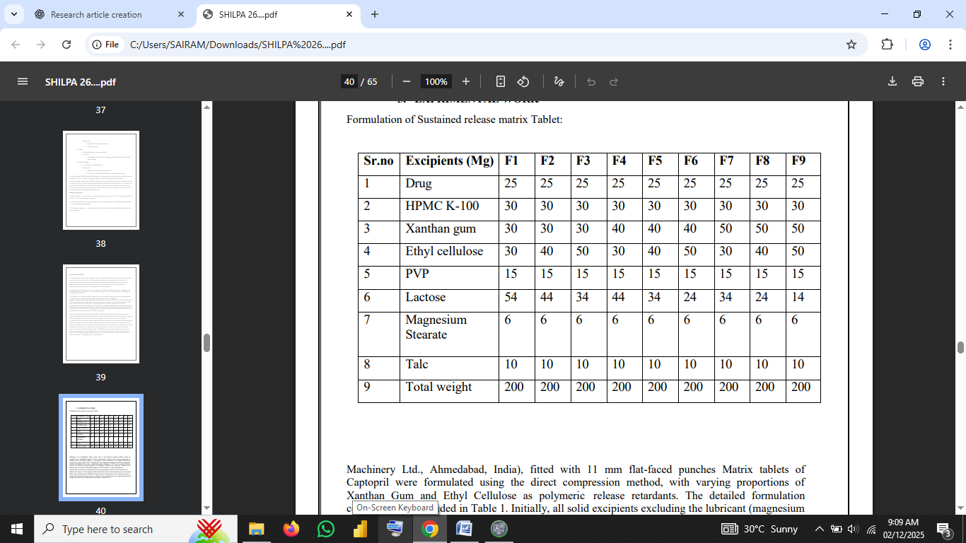 Table no 1: Formulation Composition of Matrix Tablets (F1–F9)