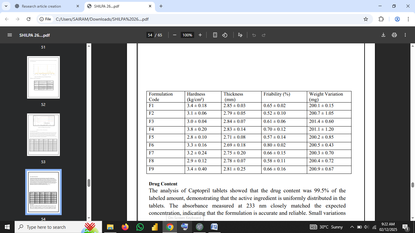 Swelling index was determined by weighing tablets before and after hydration in distilled water at 37 ± 0.5 °C. Formulations containing HPMC and Xanthan gum showed gradual swelling, forming a gel barrier that controlled release. Disintegration times ranged from > 4 h to > 12 h depending on polymer concentration.