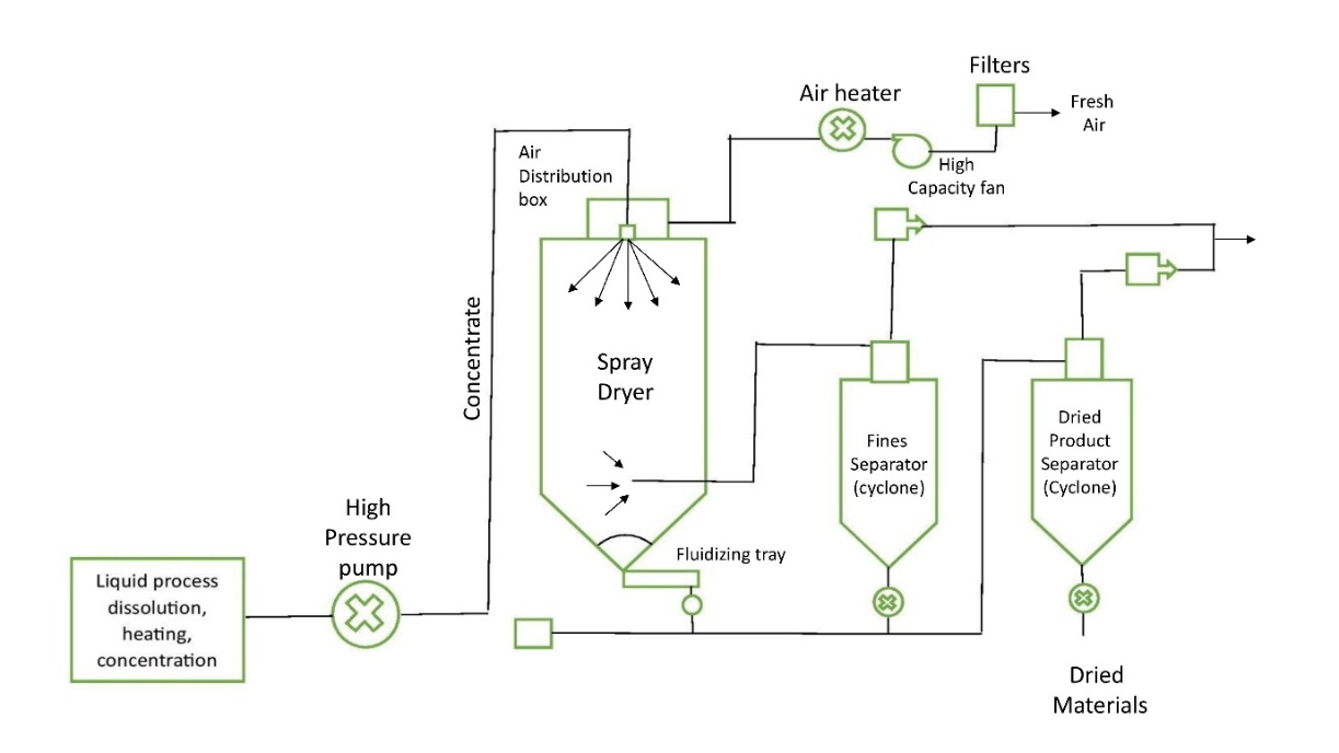 e) The drying process ends with collecting dry particles that separated from the drying air stream.
