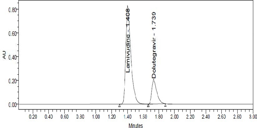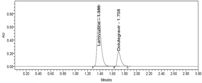 Preparation of Standard stock solutions: Accurately weighed 75 mg of Lamivudine, 12.5 mg of Dolutegravir and transferred to individual 50 mL volumetric flasks separately. 3/4th of diluents was added to both of these flasks and sonicated for 10 minutes. Flasks were made up with diluents and labeled as Standard stock solution 1 and 2. (1500 µg/mL of Lamivudine and 250 µg/mL of Dolutegravir).