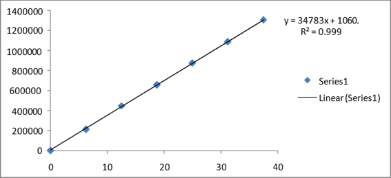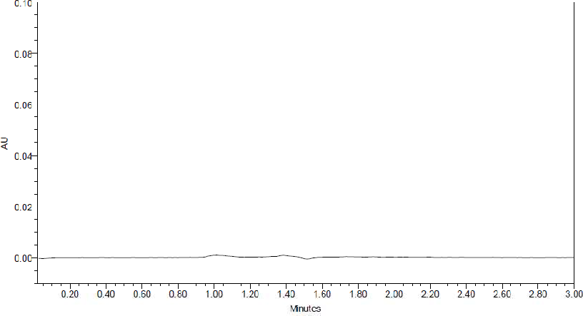 System suitability parameters: To evaluate system suitability parameters such as retention time, tailing factor and USP theoretical plate count, the mobile phase was allowed to flow through the column at a flow rate of 0.3 ml/min to equilibrate the column at ambient temperature. Chromatographic separation was achieved by injecting a volume of 1 μL of standard into HSS C18 (2.6 x 50 mm, 1.6 µm), the mobile phase of composition 70% 0.01N Na2HPO4: 30% Methanol was allowed to flow through the column at a flow rate of 0.3 ml per minute. Retention time, tailing factor and USP theoretical plate count of the developed method are shown in table 1.
