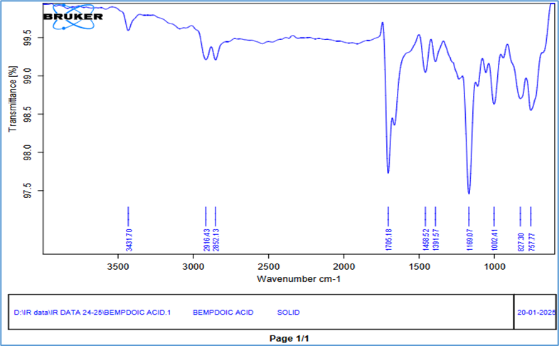 The FTIR spectrum of Bempedoic acid revealed several characteristic absorption peaks corresponding to various functional groups. A broad peak observed at 3431.70 cm?¹ was attributed to the -OH stretching vibration of the carboxylic acid group. Peaks at 2916.43 cm?¹ and 2852.13 cm?¹ indicated the presence of C-H stretching vibrations from alkyl groups. A sharp and intense peak at 1705.18 cm?¹ corresponded to the C=O stretching of the carboxylic acid group. Peaks at 1458.52 cm?¹ and 1391.57 cm?¹ were assigned to CH?/CH? bending vibrations. Additional peaks at 1169.07 cm?¹ and 1002.41 cm?¹ represented C–O stretching vibrations, typically seen in alcohols and ethers. Lastly, absorption bands at 827.30 cm?¹ and 757.77 cm?¹ were attributed to aromatic C–H out-of-plane bending vibrations, indicating the presence of aromatic moieties in the structure.