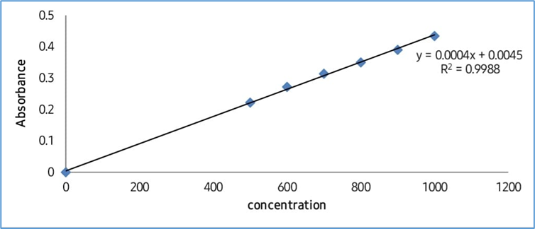 Inter-day precision was assessed by recording absorbances over three consecutive days. For 600 µg/mL, absorbance values ranged from 0.177 to -0.614, with a standard deviation of 0.00095 and a negative %RSD of -0.2. Similarly, at 700 µg/mL, the absorbance varied from 0.221 to -0.578, with a %RSD of -0.28, and for 800 µg/mL, the values ranged from 0.245 to -0.557, with a %RSD of -1.59. The presence of negative absorbance values and negative RSD percentages is not scientifically valid and may indicate instrumental error, data entry mistakes, or experimental inconsistencies during the inter-day study. This anomaly should be investigated and corrected to ensure accurate method validation.[29]