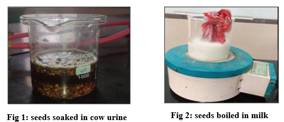 Detoxification (Shodhna process) of datura seeds8: The seeds were first soaked in cow’s urine for 2 hours, followed by thorough washing with distilled water to remove impurities. They were then boiled in 100 mL of milk for 1 hour to further purify and soften them9. After boiling, the seeds were dried completely and ground into a fine powder for use in the formulation 10.