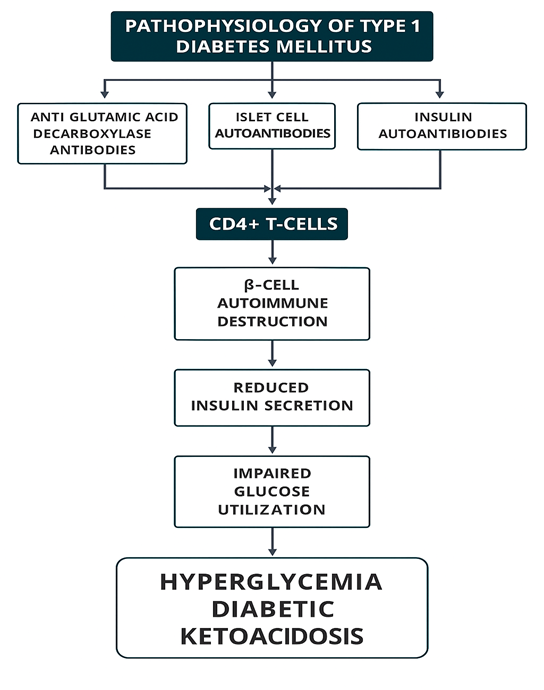 Type 1 Diabetes Mellitus (T1DM), also known as autoimmune diabetes, insulin-dependent diabetes mellitus (IDDM), juvenile-onset, or ketosis-prone diabetes, is a chronic condition primarily affecting children and young adults. It is characterized by the autoimmune destruction of pancreatic β-cells, leading to an absolute deficiency of insulin. This destruction is mediated by CD4+ and CD8+ T cells and macrophages infiltrating the islets, and is often accompanied by the presence of autoantibodies such as anti-glutamic acid decarboxylase (GAD), islet cell antibodies, and insulin autoantibodies, which are detectable in 85–90% of individuals at the onset of fasting hyperglycaemia. The exact cause remains unknown, but strong evidence supports an autoimmune mechanism. Individuals with T1DM may also present with other autoimmune disorders like Graves’ disease, Hashimoto’s thyroiditis, and Addison’s disease. The disease disrupts normal glucose regulation not only due to insulin deficiency but also because of α-cell dysfunction, resulting in excessive glucagon secretion that exacerbates hyperglycaemia and contributes to metabolic imbalances. This dysregulation often leads to diabetic ketoacidosis in the absence of insulin therapy. Furthermore, insulin deficiency impairs peripheral glucose utilization by promoting uncontrolled lipolysis and elevating plasma free fatty acids, which inhibit glucose metabolism in tissues such as skeletal muscle. It also downregulates key insulin-responsive genes like glucokinase in the liver and GLUT4 transporters in adipose tissue, further compromising glucose uptake. Lifelong insulin administration remains the cornerstone of treatment to manage this life-threatening condition4-5.