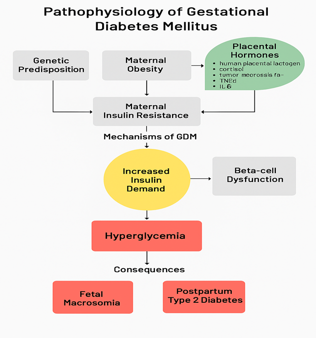 Gestational diabetes mellitus (GDM) is a metabolic disorder affecting 14% of pregnancies worldwide, or 18–20 million births annually. It arises from insufficient insulin secretion during pregnancy, leading to hyperglycaemia. Risk factors include obesity, poor diet, sedentary lifestyle, and family history of diabetes. In obese women, GDM results from amplified insulin resistance due to pre-existing metabolic dysfunction. In lean women, impaired first-phase insulin response plays a larger role. Maternal hyperglycaemia causes excess glucose transfer to the foetus, triggering foetal hyperinsulinemia and resulting in macrosomia (birth weight >4000 g)7-8.