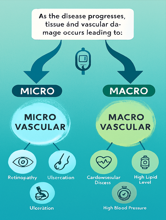 As diabetes progresses, tissue and vascular damage become more pronounced, leading to severe complications such as diabetic retinopathy, neuropathy, cardiovascular disorders, and ulceration. Patients with long-standing Type 1 diabetes mellitus (T1DM) are particularly vulnerable to microvascular complications, including damage to the retina, kidneys, and peripheral nerves. They may also develop macrovascular diseases affecting the coronary arteries, heart, and peripheral vasculature.