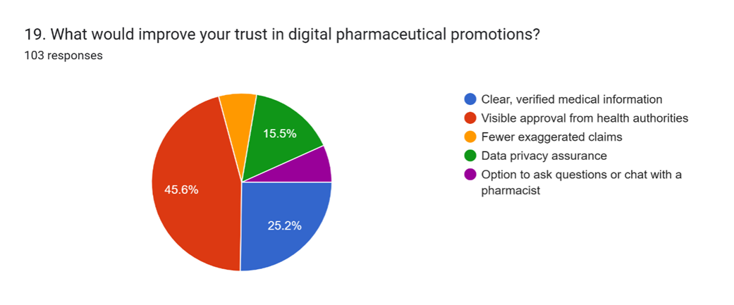 The factor that would most improve trust is visible approval from health authorities 45.6%, followed by clear verified medical information 25.2%, data privacy assurance 15.5%, fewer exaggerated claims 6.8%, and the option to ask questions or chat with a pharmacist 6.8%. This highlights the importance of credibility and transparency.