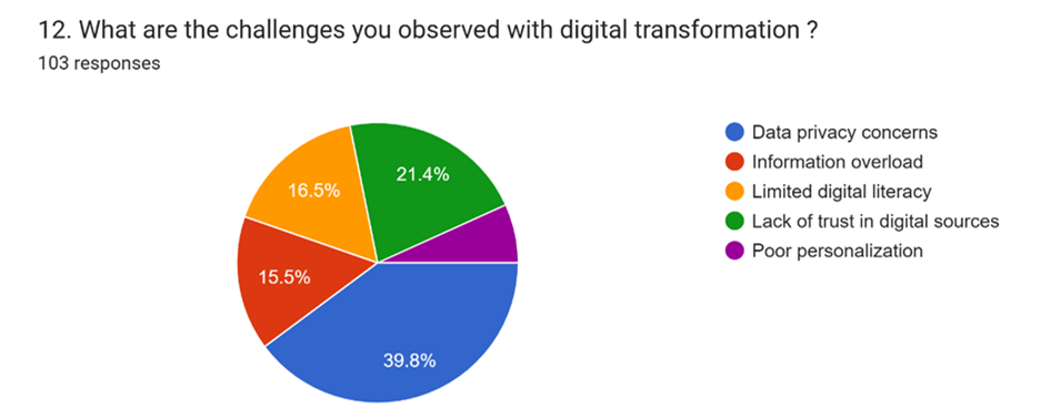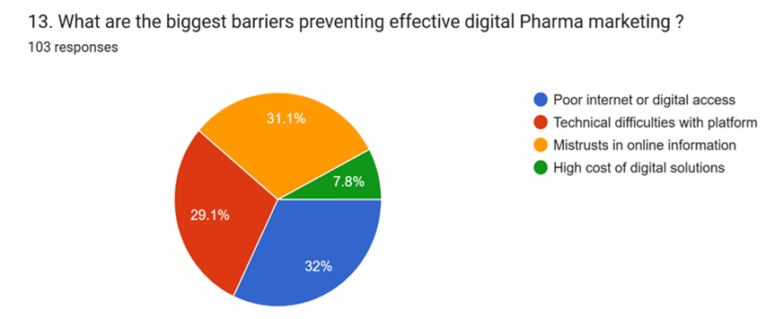 The main barriers to effective digital pharma marketing are data privacy concerns, lack oftrust in digital sources, limited digital skills, information overload, and poor personalization. Most respondents 39.8% said data privacy is the biggest concern, while others pointed to trust issues 21.4%, limited digital literacy 16.5%, too much information 15.5%, or poor personalization 6.8%.