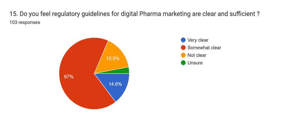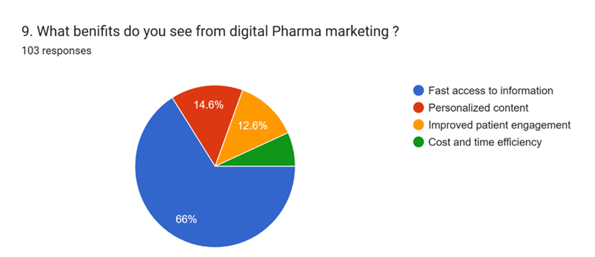 Most respondents 66% saw fast access to information as the main benefit of digital pharma marketing, followed by personalized information 14.6%, improved patient engagement 12.6%, and cost and time efficiency 6.8%.