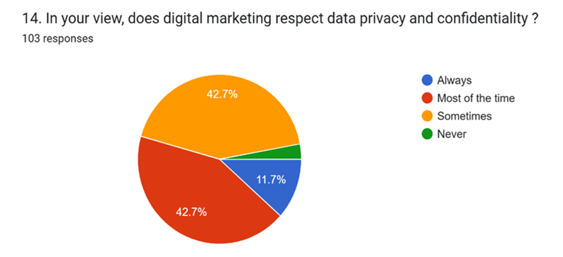 Regarding data privacy and confidentiality, most participants were uncertain. 42.7% believed that privacy is respected only sometimes, and another 42.7% felt it is respected most of the time. A smaller group, 11.7%, felt that privacy is always protected, while 2.9% believed it is never protected. This indicates a need to improve transparency and data security in digital marketing practices.