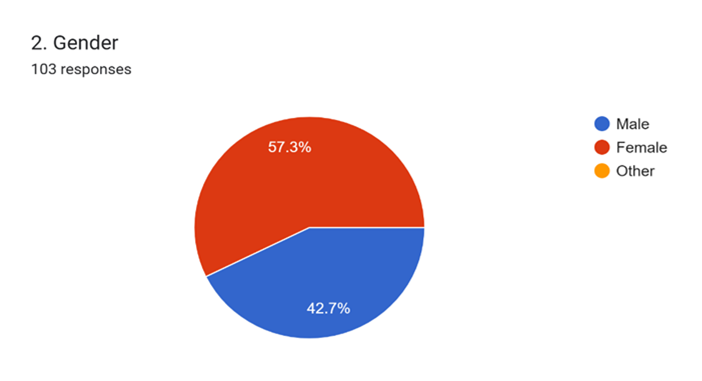 Among 103 study participants 59(57.3%) were females and 44(42.7%) were males. The frequency of gender wise details is summarised in table 2 and figure 2.