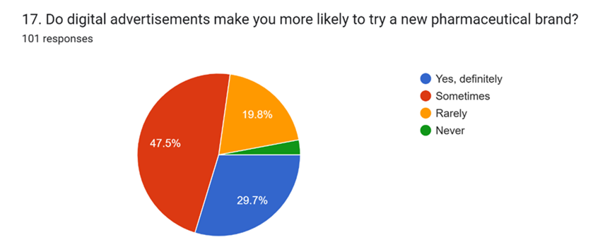 The influence of digital ads on trying new pharmaceutical brands was moderate. 47.5% said they sometimes try new products, 29.7% definitely do, 19.8% do so rarely, and 3% never do. This shows that digital advertising has a positive but not strong influence on consumer behavior.