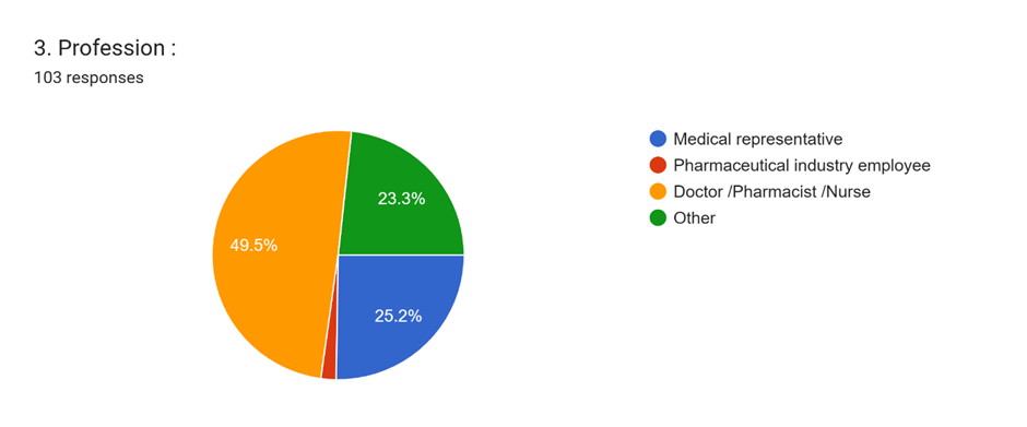 The respondents were grouped into four professional categories: Medical Representatives, Pharmaceutical Industry Employees, Doctors/Pharmacists/Nurses, and Others. Most respondents were Doctors, Pharmacists, or Nurses49.5%, followed by Medical Representatives and Others 23.3% each. Only a small proportion of respondents were Pharmaceutical Industry Employees 1.9%.