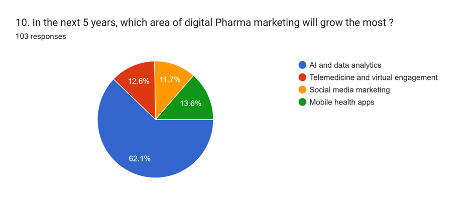 The major trends in digital pharma marketing are AI and Data Analytics, Mobile Health Applications, Telemedicine and Virtual Engagement, and Social Media Marketing. Most respondents 62.1% said AI and Data Analytics is the most important trend because it helps with technology-based decisions and personalized marketing. Mobile Health Applications were chosen by 13.6%, Telemedicine by 12.6%, and Social Media Marketing by 11.7%.