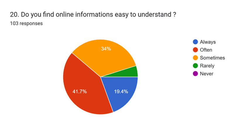 Finally, 41.7% of respondents said that digital information is often easy to understand, 34% said sometimes, and 19.4% always find it easy. Only 5% reported rarely and never 0%. This suggests the overall clarity of online information is adequate but still requires improvement.