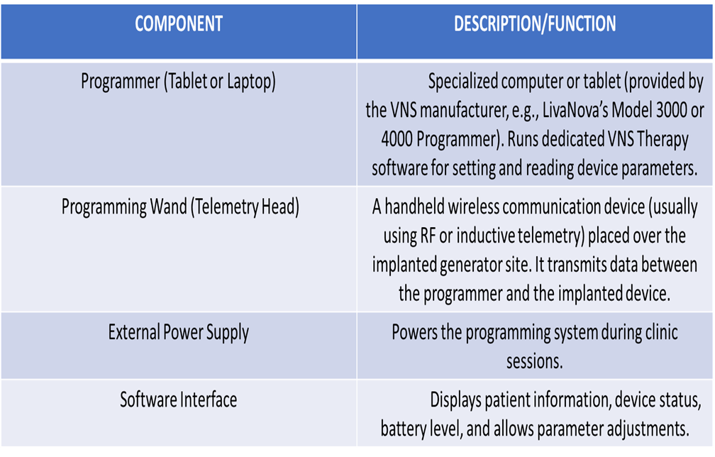 The programming system of a vagus nerve stimulation (VNS) device is the external equipment that allows a clinician to set, adjust, and monitor how the implanted pulse generator delivers electrical stimulation to the vagus nerve.