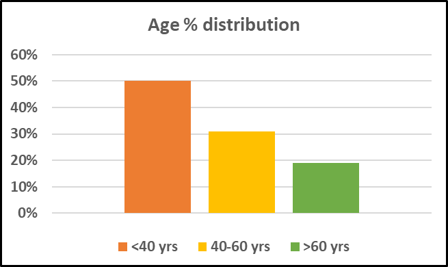 A total of 665 prescriptions were analysed over 2 months from February 2024 to March 2024. The demographic distribution of patients mirrored a decreasing trend with increasing age as a higher proportion of patients 50% (332) were <40 years and those aged 40 - 60 years were 31% (207) while 60 years and above were 19% (126) [Figure 1].