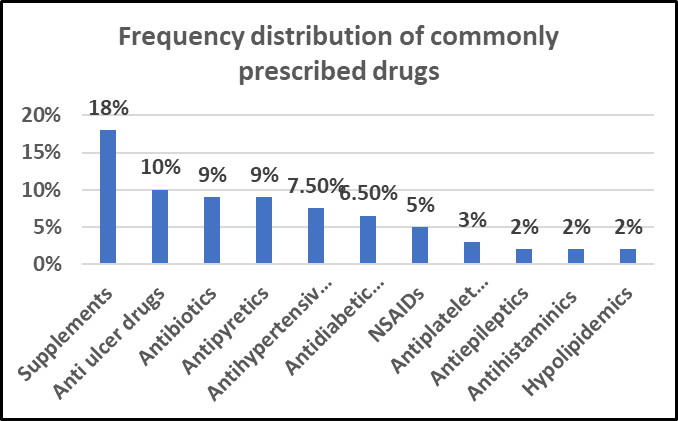 It was interesting to find that among the 2628 drug products prescribed, the highest percentage (18%) of prescribed drugs were supplements which ranked first followed by the antiulcer drugs (10%), antipyretics (9%), antibiotics (9%), anti-hypertensive drugs (7.5%), antidiabetic drugs (6.5%), NSAIDs (5%), antiplatelet drugs (3%), antiepileptics (2%), antihistaminic drugs (2%) and hypolipidemic drugs (2%) [Figure 2].