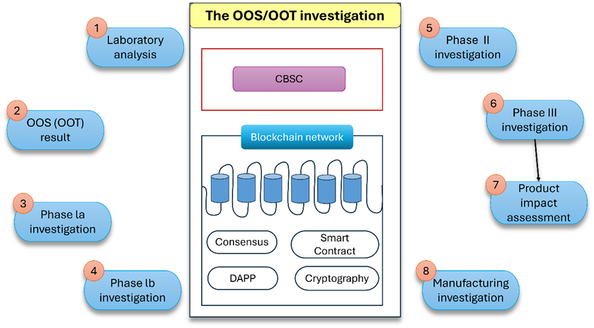 3. The OOS/OOT investigation: In Figure, the OOS/OOT query is visible. After deciding to move forward with the OOS/OOT study, laboratory analysis must be finished in order to receive the OOS/OOT outcome. The smart contract will decide whether to proceed to the next phase of the inquiry based on this result. The OOS survey will be divided into multiple phases, each overseen by a smart contract.
