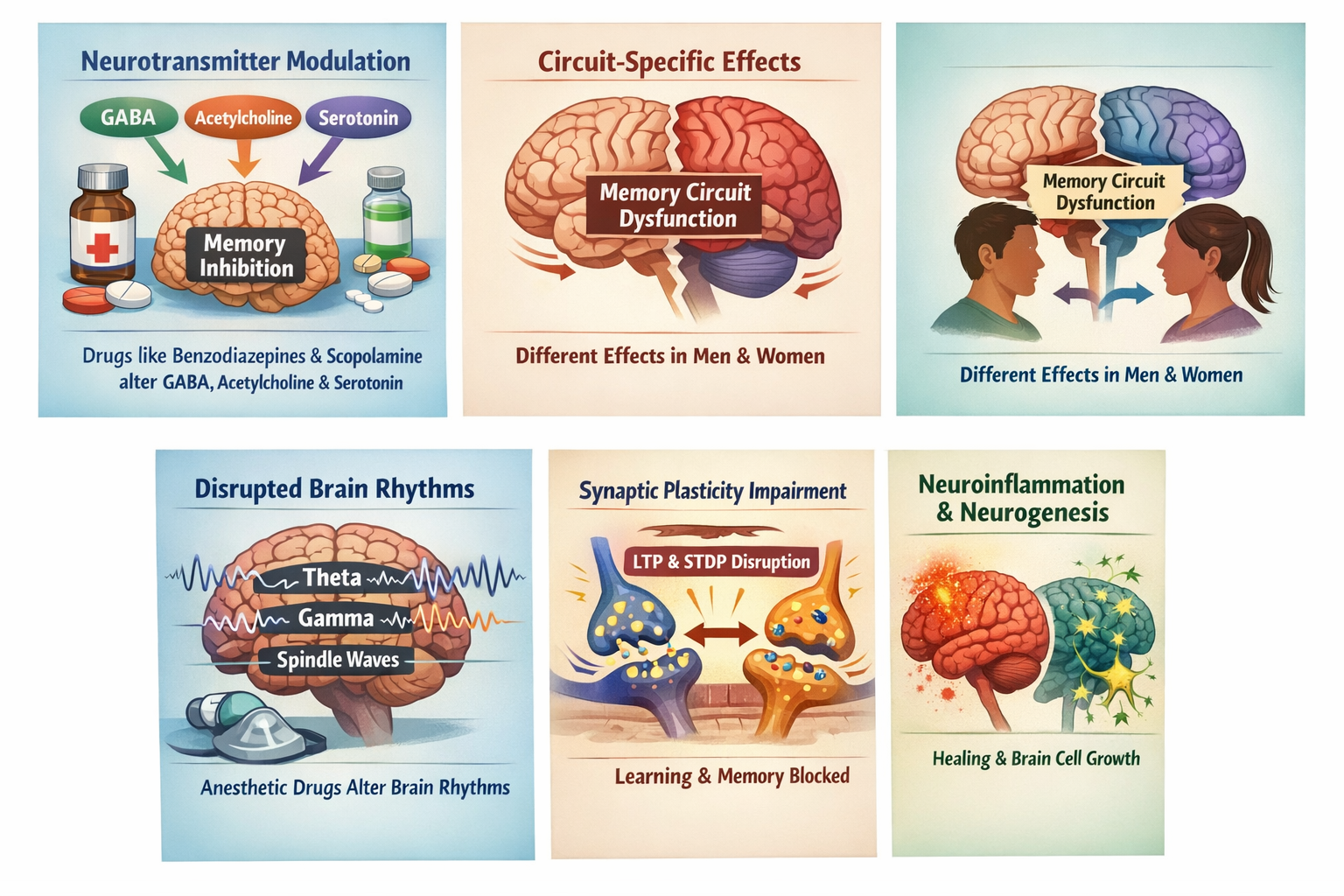 Anesthetic drugs alter critical neural oscillations such as theta, gamma, and spindle rhythms that are vital for memory consolidation. For example, sevoflurane enhances hippocampal theta rhythms through TASK-3 channel modulation, which impairs memory processing by disrupting normal oscillatory patterns needed for encoding and consolidation of memories [28].