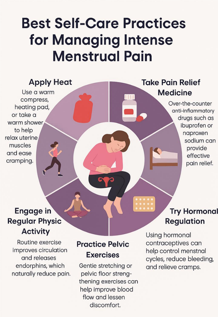 Effective management of dysmenorrhea involves a multidimensional approach that combines pharmacological, non-pharmacological, and lifestyle interventions. Pharmacologically, nonsteroidal anti-inflammatory drugs (NSAIDs) remain the first-line therapy, acting by inhibiting cyclooxygenase enzymes and reducing prostaglandin production. Hormonal contraceptives, including oral pills, intrauterine systems, and injectables, offer additional benefits by suppressing ovulation and stabilizing endometrial growth. In refractory cases or secondary causes, surgical interventions may be required. Complementary methods such as heat therapy, regular physical exercise, dietary modifications, stress reduction, and the use of alternative therapies like acupuncture or herbal medicine have also shown supportive benefits. A personalized treatment plan, tailored to symptom severity, individual preference, and the presence of comorbidities, is essential for optimal results.