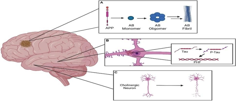 From a pathophysiological perspective, EOAD differs from LOAD in its stronger genetic contribution. Mutations in the amyloid precursor protein (APP) and the presenilin genes (PSEN1 and PSEN2) account for a substantial proportion of familial EOAD cases, leading to abnormal amyloid processing and early, aggressive disease onset.[6]Beyond genetics, EOAD involves mitochondrial dysfunction, oxidative stress, neuroinflammation, synaptic failure, and cholinergic deficits, making it a complex, multi-factorial disorder. Advances in biomarkers— including cerebrospinal fluid (CSF) assays of amyloid and tau, plasma phosphorylated tau, and neurofilament light chain, as well as neuroimaging modalities (FDG-PET, amyloid PET, tau PET)—have improved diagnostic precision and facilitated earlier detection.Despite progress, treatment options remain limited. [13] Current pharmacological therapies such as cholinesterase inhibitors (donepezil, rivastigmine, galantamine) and NMDA receptor antagonist (memantine) provide symptomatic relief but do not halt disease progression.