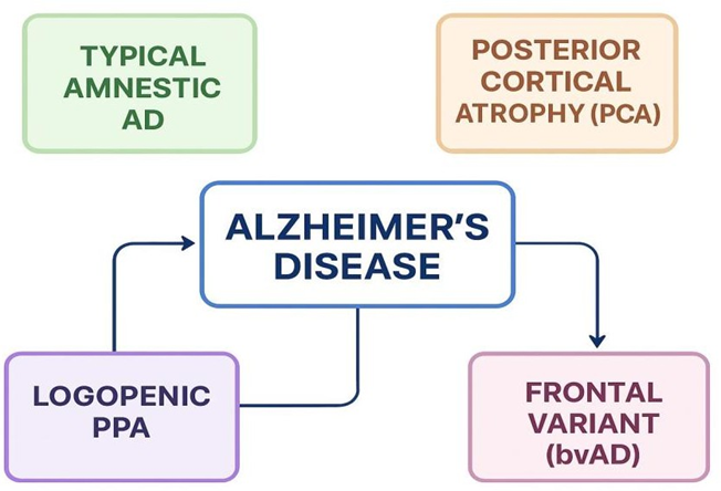 Alzheimer’s disease (AD) is not a uniform clinical entity but a spectrum of syndromes. While the majority of patients present with the typical amnestic variant, a substantial subset—especially those with early-onset AD (EOAD) develop atypical presentations involving visual, language, behavioral, or motor symptoms. Recognizing these variants is crucial for accurate diagnosis and management, as they are frequently misdiagnosed as other dementias or psychiatric conditions.