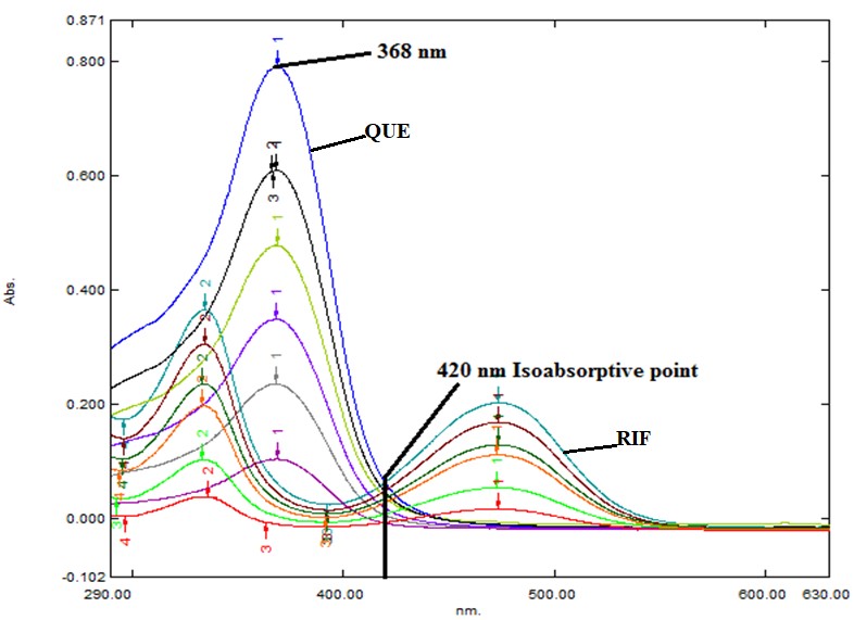 Figure 2. Combined absorption spectra of RIF and QUE showed isoabsorptive point (420 nm) in pH-6.8 phosphate buffer.