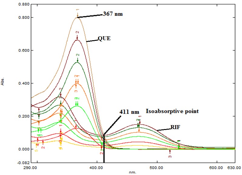Figure 1. Combined absorption spectra of RIF and QUE showed isoabsorptive point (411 nm) in HCl (0.1 M).
