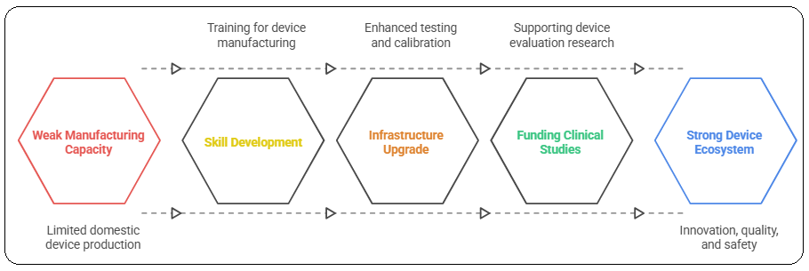 The Government of India launched a ?500 crore strategic scheme aimed at enhancing domestic manufacturing capacity, supporting skill development programmes, upgrading infrastructure for device testing and calibration, and funding clinical evaluation studies. This investment is expected to create a strong ecosystem for innovation, quality assurance, and materiovigilance integration at every stage of the device lifecycle (Figure 1). [9-10]
