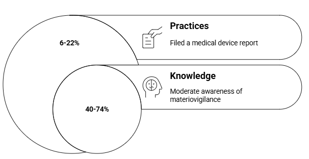 Understanding the knowledge, attitudes, and practices (KAP) of healthcare professionals toward materiovigilance is crucial for identifying barriers to effective adverse event reporting and designing targeted interventions. Several cross?sectional surveys conducted in India over the past few years have shed light on the current status among key professional groups.