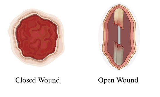Wounds can generally be classified as open or closed. A closed wound is a type of injury that doesn't penetrate the skin's surface but harms the tissues beneath it. A bruise serves as a typical illustration of this. Conversely, open wounds pierce the skin's surface and can also harm the tissues beneath [2].