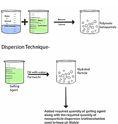 In this method, the organic phase, which contains both the drug and polymer, is introduced into an aqueous surfactant solution. This interaction causes the polymer to precipitate out, forming nanoparticles. Once the excess solvent is removed, the resulting polymeric nanoparticles are collected [81]. Gelling agent and necessary amounts of nanoparticle dispersion are added after moistening the particles. The pH is stabilized by using triethanolamine [82].
