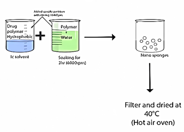 Initially, a drug-polymer mixture is injected into an aqueous phase while continuously stirred at 1000 rpm for two hours [78]. Following this, the resulting nanosponges undergo filtration and are dried in a hot air oven at 40°C for 24 hours. For optimal dispersion, it is recommended to immerse the polymer in water for two hours before gel formation, followed by agitation at 6000 rpm [79]. The pH of the mixture is then adjusted using a pH-modifying agent, and finally, the aqueous dispersion is combined with the optimized nanosponges suspension and permeation enhancers [80].