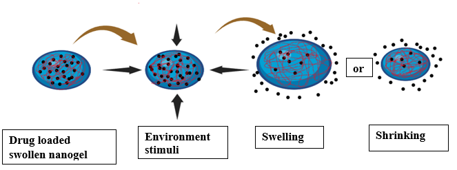 When an aqueous medium enters the nanogel structure through its porous surface, the nanogel absorbs the liquid and expands. This swelling process facilitates the gradual release of the drug contained within the gel. The speed and extent of drug release depend on how much the nanogel swells in response to the surrounding environment. The mechanism of drug release may be classified in three categories: