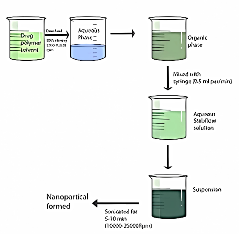 The drug-polymer mixture is agitated in an aqueous phase at a high rotational speed of 5000 to 10,000 rpm, facilitating the formation of an organic phase [85]. A syringe fitted with a needle is used to add the organic phase at a rate of 0.5 mL per minute to the aqueous stabilizer solution. After six minutes of agitation at speeds between 10,000 and 25,000 rpm, sonication is applied for five to ten minutes to further stabilize the suspension.