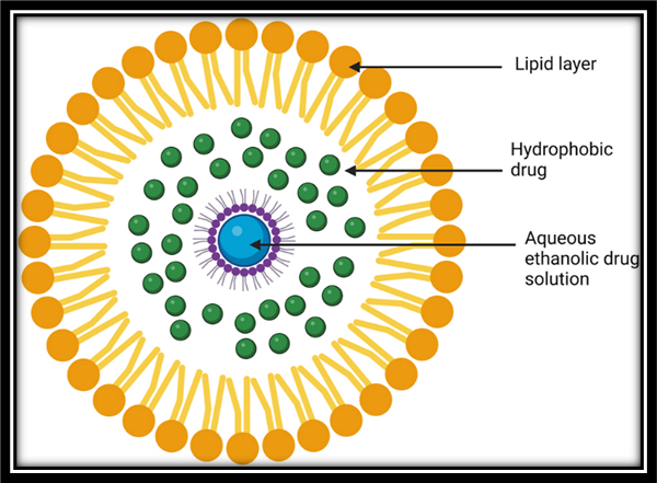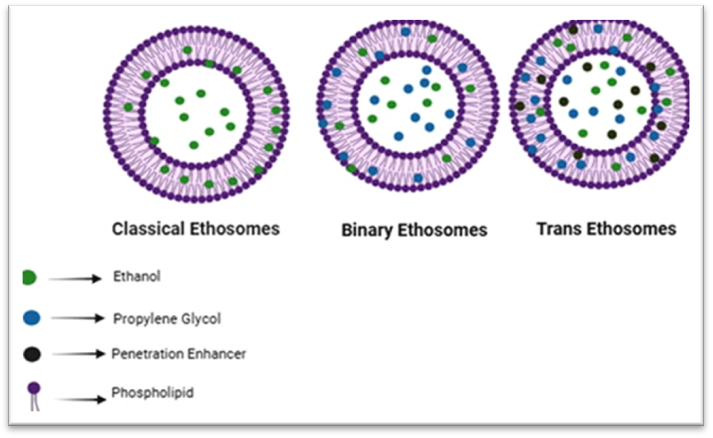 Ethanolic liposomes, are called as Ethosomes, are non-invasive, flexible, and pliable vesicular delivery systems. They enhance the distribution of active ingredients by facilitating the penetration of medication into the deep skin layer. Ethosomes are lipid vesicles containing phospholipids, alcohol (ethanol or isopropyl alcohol), and water, developed by Touitou. They enhance skin drug delivery, with penetration improved by additives like propylene glycol. Age-activator agents, such as ethanol and sodium cholate, boost carrier penetration through the stratum corneum, enabling effective local and systemic delivery of both hydrophobic and hydrophilic drugs. Ethosomes are widely recognized for their efficacy in transdermal drug delivery. Key components include phospholipids, alcohol, cholesterol, polyglycol, dye, and the vehicle. They can encapsulate drugs with hydrophilic, lipophilic, or amphiphilic properties. These soft, malleable vesicles deliver drugs to deep skin layers or systemic circulation. Ethosome sizes range from nanometers to microns.