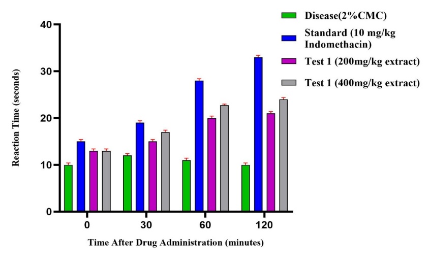 The hotplate technique was also used to assess the extract's analgesic properties. Rats will be kept in a restrainer onto a hot plate that is kept at 55°C. The latency period, also known as the reaction (measured in seconds), was the amount of time it took the rats to react to thermal discomfort by jumping or licking their paws. It was recorded before the treatments were administered (0 minutes) and fifteen, thirty, forty-five, and 60 minutes later. The highest level of analgesia is necessary to avoid damaging the paw tissues. The formula below will be used to determine the minimum possible analgesia (MPA):
