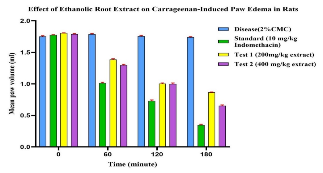 One of the body's most important defenses against infections, wounds, and irritants is inflammation. On the other hand, long-term inflammation can cause major illnesses like cancer, heart disease, and arthritis. Psidium guajava, or guava, is one of the species that are frequently used in traditional medicine to treat inflammation. Psidium guajava's roots have not gotten much scientific attention, despite the fact that its fruits and leaves have been extensively researched. This study uses the paw edema caused by carrageenan method in Wistar rats to assess the anti-inflammatory properties of the ethanolic extract of the root of Psidium that guajava.The existence of biologically active substances such as tannins, flavonoids, alkaloids, the saponins and phenolic compounds was verified by medicinal plants evaluation of the root extract. These components are known to have the ability to lessen oxidative stress and inflammation. Rats' hind paws were injected with 1?rrageenan solution to create inflammation in the experimental model. The usual medication was indomethacin (10 mg/kg), and the extract was given orally at dosages of 200 and 400 mg/kg. To evaluate the anti-inflammatory response, paw volumes were evaluated at 0, sixty, one hundred and twelve, and 180 minutes.Animals who received the ethanolic root extract showed a significant and dosage-dependent decrease in paw edema, particularly at the 400 mg/kg dose, according to the results. The extract has significant anti-inflammatory activity, as evidenced by the inhibitory impact being similar to that of the conventional medication. The results demonstrate Psidium guajava root's potential as a natural source of anti-inflammatory chemicals and validate its traditional use in inflammatory disorders. New anti-inflammatory medications made from guava root may result from additional research concentrating on the separation of active ingredients and their modes of action