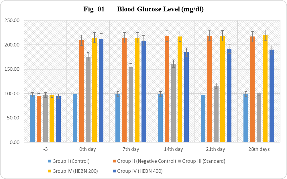The hypoglycemic effects of HEBN (at doses of 200 and 400 mg/kg body weight) were examined in Wistar rats with STZ-induced hyperglycaemia (Table 1.5). The results showed a considerable drop in blood glucose levels (Fig. 1) compared to the negative control group (STZ induced) on the 14th, 21st, and 28th days. The statistical tests were not passed before 14 days. HEBN 200 mg/kg dose, not significant in whole studies. Glibenclamide (Group III) was highly significant and markedly decreased glucose levels all days. The findings suggest that while HEBN at a 200 mg/kg dose did not show significant effects throughout the study, the 400 mg/kg dosage may warrant further investigation due to its potential benefits. Additionally, the consistent efficacy of Glibenclamide reinforces its role as a standard treatment in managing hyperglycaemia in this model.