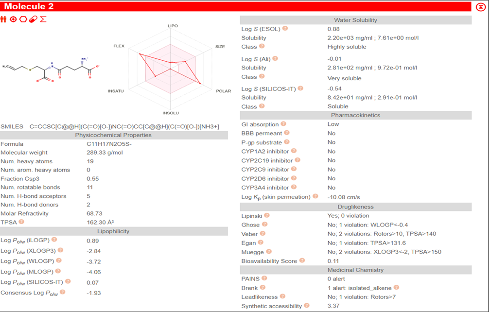Table-2 The Swiss ADME web tool was employed to predict the physicochemical properties, ADME characteristics, pharmacokinetic behaviour, drug-likeness, and medicinal chemistry suitability of Gamma-L-glutamyl-S-ally -L–cysteine.