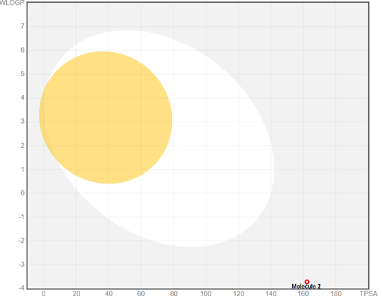 The molecule appears outside the boiled egg, meaning it is predicted to have low human intestinal absorption and no significant BBB penetration.