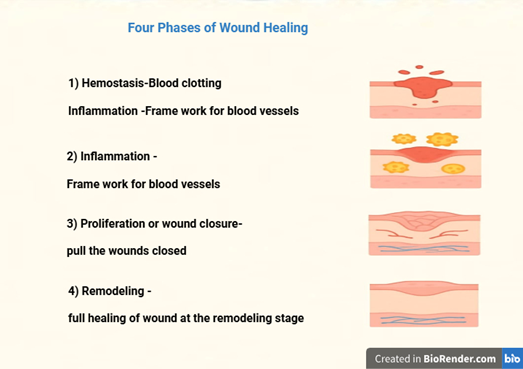 Healing the skin after an injury is crucial for restoring tissue function and overall well-being. This process is complex and involves a carefully coordinated effort between various cell types and signalling molecules, all working together in a precise sequence to repair the damaged area and bring the skin back to its original state[10]. When the skin gets injured, the body kicks off a natural healing process to repair the damage. This process happens in four overlapping stages: first, hemostasis, where the body works quickly to stop the bleeding; next, inflammation, which helps fight off infection and clear out damaged cells; then proliferation, where new tissue starts to grow; and finally, maturation, where the new tissue gets stronger and more organized. Supporting any of these stages—whether through physical care, medications, or biological treatments—can help the wound heal faster and improve overall recovery[11]. Wound healing generally happens in four main phases, as shown in Figure 1: hemostasis, inflammation, cell growth (proliferation), and tissue remodelling. These stages aren’t separate events—they often overlap, with various types of cells working together in a well-coordinated way to repair the damage and restore the skin’s structure and function[10].
