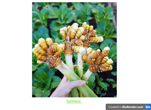 Turmeric (Curcuma longa) (1,7-bis(4-hydroxy-3-methoxyphenyl)-1,6-hepta-diene-3,5-dione) is perennial herbaceous plant which belong to family of Zingiberaceae or gincger family[15]. Turmeric which is native to South and southeast Asian countries is widely used in the ancient systems of medicine including Ayurveda, Unani, and Traditional Chinese Medicine. It is extensively grown in India and it is the largest manufacturer of turmeric globally, largest in export [16].The consumed part of the plant is the rhizome which is boiled dried and crushed into a bright yellow-orange powder. The powder is commonly utilized as a culinary spice especially in Indian and Southeast Asian cuisines, and similarly in most cultures and religions has associated cultural and religious meaning [17]. Curcumin a yellow polyphenol that is the major active constituent of turmeric, has a broad range of biological activities. Most of the medicinal properties shown by Turmeric are credited to curcumin, which imparts curcumin its characteristic colour. Despite its potential curcumin has low bioavailability meaning it is poorly absorbed into the bloodstream. To enhance its absorption it is often consumed with piperine an alkaloid from black peper, which increases bioavailability significantly[17]. Swelling is a body's true & right move when hurt or sick. Study shows it starts with a chain of steps by the body's guard (immune) system. It helps in shield & mend tasks, but it can lead to more body issues & health bad turns[18]. The root of Curcuma longa has been used for a long time. It fights germs & keeps bugs away. Studies show that curcumin, its main part, kills a wide range of germs. This includes germs that can cause bad bugs, colds, Mold, & malaria. Since it is safe even in big doses (up to 12 g/day in tests), curcumin is used as a model to make new germ-fighting drugs. Experts have made many forms of curcumin. They did this to boost & change how well it can kill germs[19].