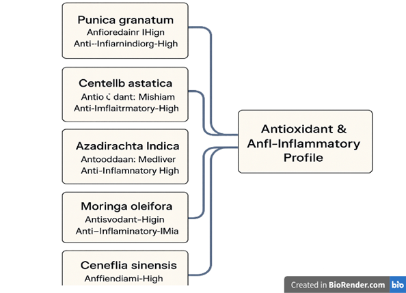 Punica granatum is rich in antioxidants and shows anti-inflammatory and antimicrobial effects. The polyphenols in Punica granatum act as antioxidants and prevent pro-inflammatory cytokines. Ellagic acid enhances the growth of fibroblasts and the production of collagen, whereas punicalagin provides antimicrobial defense. Additionally, these substances promote angiogenesis and accelerate the process of epithelialization[26].